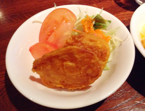 窓側がビュッフェ台。サラダ系3種、カレーが3種、ご飯1種、ナン、スナックというのは芋のフライでした。それとラッシーと烏龍茶。カレーのバイキングとしてみても少ないほうかな。