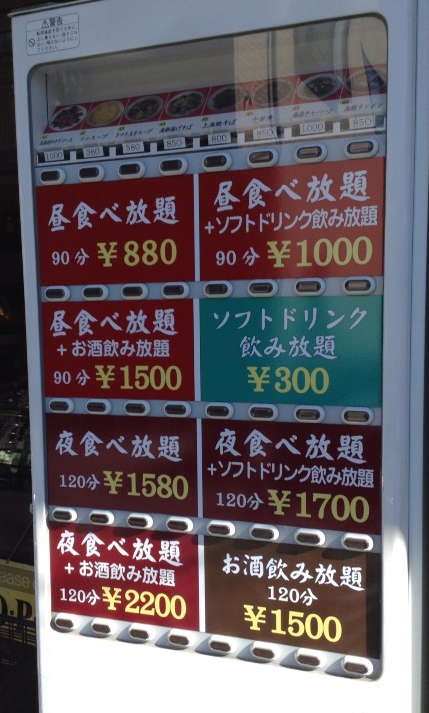 金額:880円(90分+120でドリンクバー付きor+620円で酒飲み放題付き)、夜は1580円(120分+120でドリンクバー付きor+620円で酒飲み放題付き)