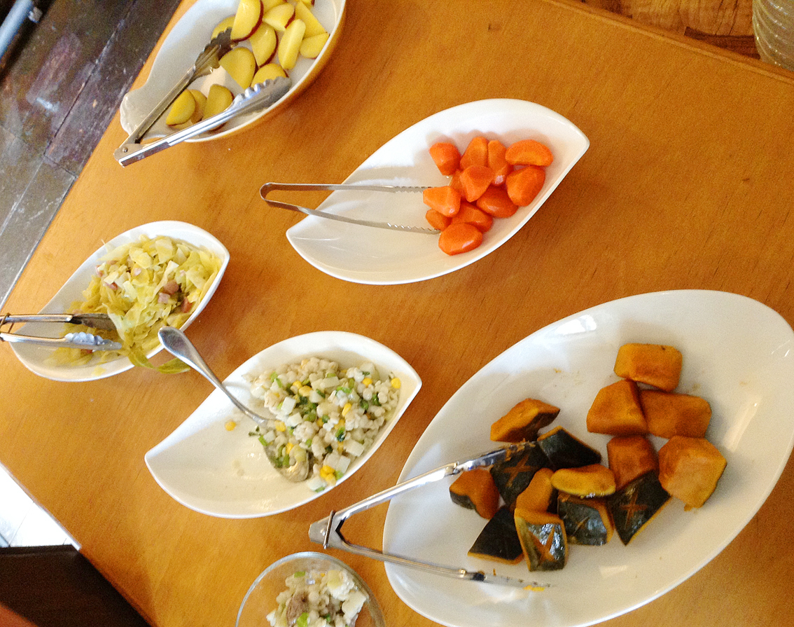 実はこれ、感動的な芸の細かさなんですよ。カボチャは全部飾り包丁ついてるしさつまいものレモン煮は角取り全部してある。食べ放題ってこういうのあんまり無いよね。特にこの価格帯だと。