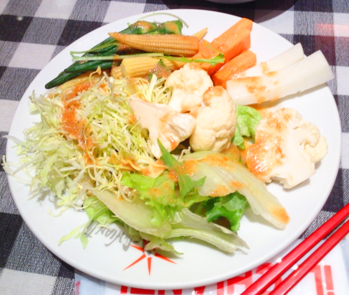 サラダコーナーは生野菜、ここは有名なドレッシングがあるそうなのでそれを掛けていただく。