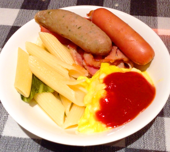 日替わりパスタ1種、コロッケ、スクランブルエッグ、ベーコン、ハーブウインナー3種類くらい。